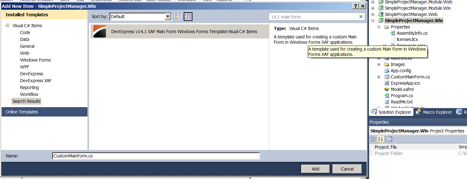 1. In Solution Explorer, select YourSolutionName.Win project and press Control+Shift+A to add a new item and look for the DevExpress v14.1 XAF Main Form Windows Forms Template, call it CustomMainForm and finally press the Add button.
