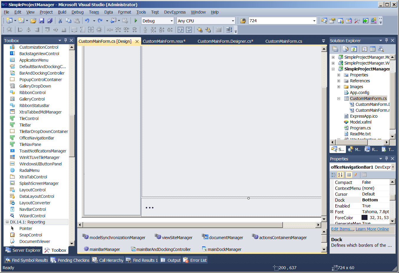 4. Invoke the Toolbox (Control+Alt+X) and drag and drop the OfficeNavigationBar component to the form, right underneath of the viewSitePanel component. Then in the property grid, select the officeNavigationBar1 component and customize its properties as follows:
