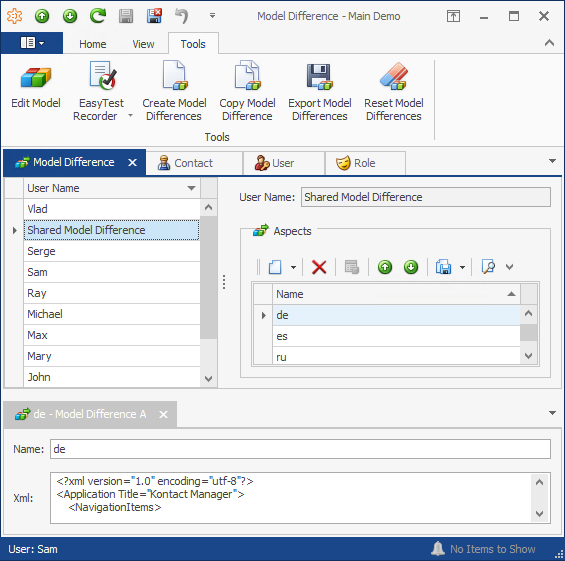 4. Use the application UI to edit administrative settings. In order to do this, you must add the ModelDifference and ModelDifferenceAspect classes into the navigation system as described at eXpressApp Framework > Concepts > System Module > Navigation System.